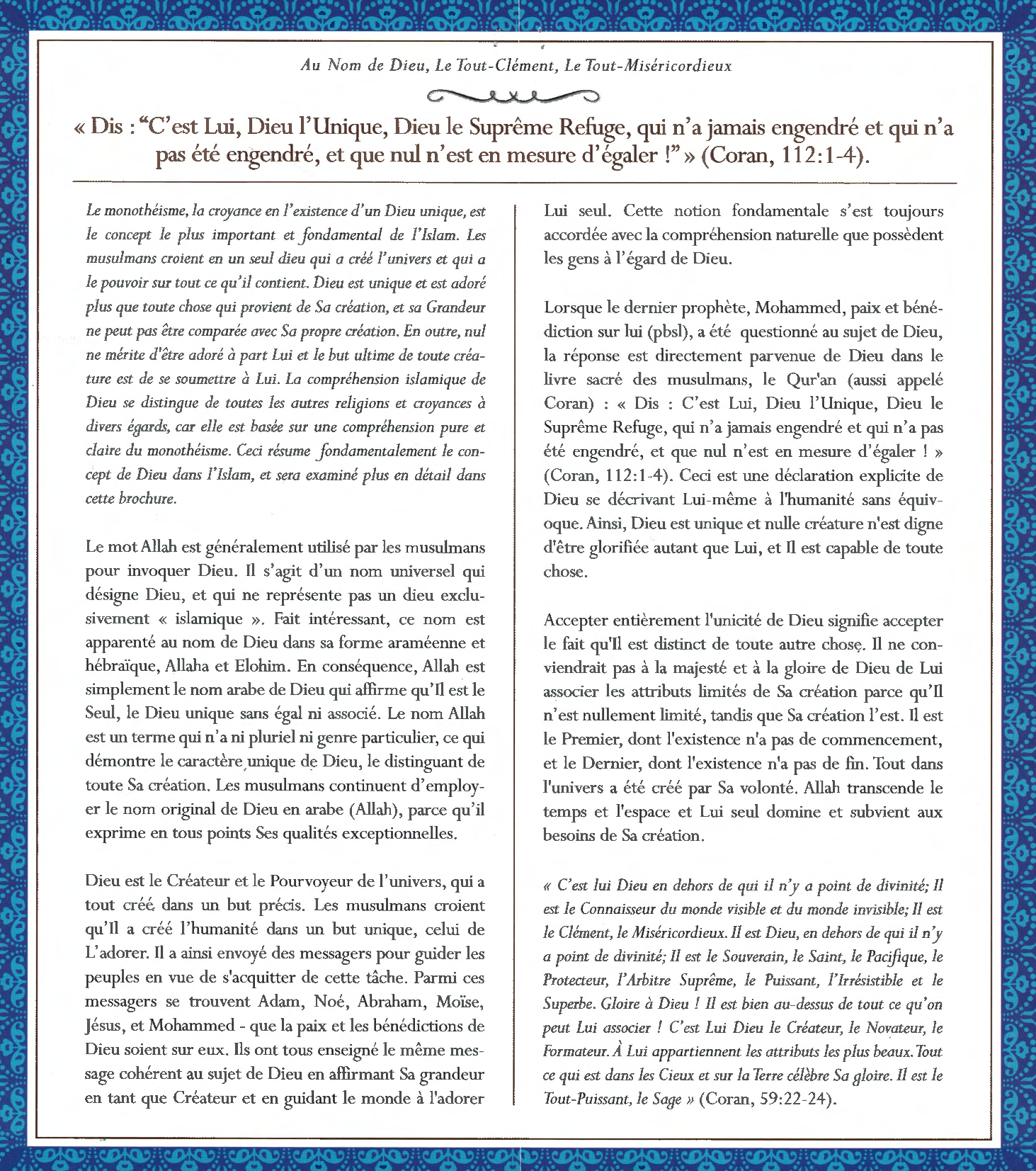Le monothéisme, la croyance en l’existence d’un Dieu unique, est le concept le plus important et fondamental de l’islam. Les musulmans croient en un seul dieu qui a créé l’univers et qui a le pouvoir sur tout ce qu’il contient. Il est unique et est adoré plus que toute chose qui provient de Sa création, et sa Grandeur ne peut être comparée avec Sa propre création. De plus, nul ne mérite d'être adoré à part Lui et le but ultime de toute créature est de se soumettre à Lui. La compréhension islamique de Dieu se distingue de toutes les autres religions et croyances à divers égards, car elle est basée sur une compréhension pure et claire du monothéisme. Ceci résume essentiellement le concept de Dieu dans l’islam qui examiné plus en détail dans cette brochure.