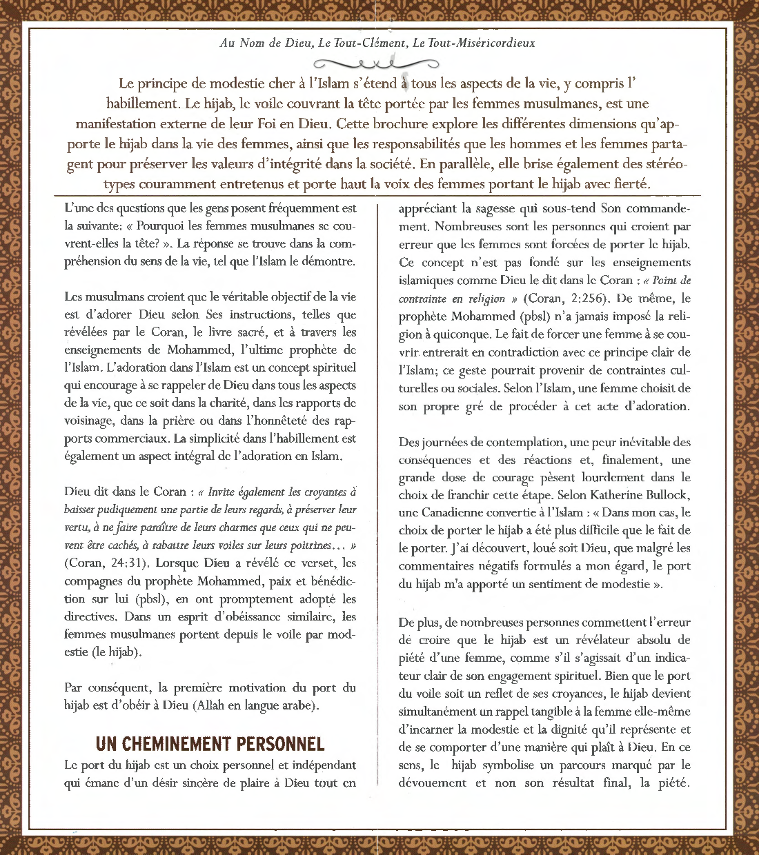 Le code de modestie de l’islam s’étend à tous les aspects de la vie, y compris l’habillement. Le hijab, le voile couvrant la tête portée par les femmes musulmanes, est une manifestation externe de leur engagement interne envers la vénération de Dieu. La présente brochure explore les différentes dimensions qu’apporte le hijab aux vies des femmes, ainsi que les responsabilités que les hommes et les femmes se partagent pour maintenir la modestie dans la société. Elle brisera également des stéréotypes couramment entretenus et célébrera les voix des femmes qui portent le hijab avec fierté.